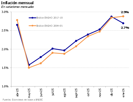 La inflación está difícil de domar. El 2.9% de enero sorprendió negativamente, ubicándose por encima de lo esperado por el mercado y marcando el octavo mes consecutivo de aceleración mensual. La nota positiva es que la inflación núcleo se desaceleró del 3% al 2.6%, y en febrero los aumentos en alimentos vienen siendo más moderados. Con el nuevo índice, la medición habría rondado el 2.7%. Sin embargo, la postergación de la nueva canasta (que otorga mayor peso a los servicios) parece responder más a los ajustes tarifarios pendientes para el resto del año que al dato puntual de enero. Como señalamos habitualmente, la desinflación es un proceso largo y no lineal, pero preocupa la ausencia de un ancla clara. El último REM ya mostraba un repunte en las expectativas. Prevemos que la inercia seguirá pesando y que la inflación cerrará 2026 cerca del 27%.