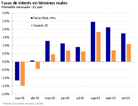 - Normalizando las tasas. Después del fuerte apretón monetario previo a las elecciones, las tasas de interés comenzaron a acomodarse en niveles más razonables en los últimos días. La semana pasada, el Tesoro liberó unos AR$ 5 billones en la licitación de deuda y aportó liquidez comprando bonos en el mercado secundario, lo que contribuyó a la baja de las tasas. En la misma dirección se movió el BCRA, que redujo la tasa de la rueda repo del 25% al 22%, estableciendo un nuevo piso para las tasas cortas y arrastrando a las tasas pasivas. Las tasas activas también están descendiendo, aunque a un ritmo más lento.