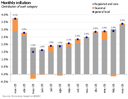 Pasó lo peor para la inflación. El dato de marzo fue de 3.4%, en línea con lo que anticipábamos en Econviews. Las principales alzas se registraron en educación (típico de marzo), alimentos (3.4%, con fuerte incidencia de la carne) y restaurantes y comidas fuera del hogar. La suba de combustibles también dejó huella, aunque estimamos que parte de ese efecto se trasladará a abril. De todos modos, nuestro relevamiento de precios online muestra una desaceleración marcada en las últimas dos semanas: los alimentos pasaron de correr al 3.4% mensual al 2.4%, en un contexto donde los aumentos en precios regulados también se moderaron. Para abril esperamos una desaceleración hacia el 2.7%.