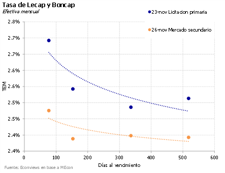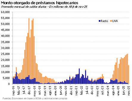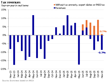 Rates keep falling. Short-term interest rates (repos and caución) have stabilized around 20%, with the Central Bank lowering the floor to 20% in the simultáneas (reverse repo) operations market. This pulled the rest of the curve downward and improves the rate at which the Treasury will be able to roll over its debt in tomorrow’s debt auction. The TAMAR rate is already trading near 33% (down from over 60% before the elections), and overdraft rates have fallen to around 38%. Credit is recovering only modestly in November, but it will likely accelerate in the coming months.