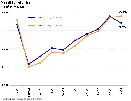 Inflación, INDEC y polémica. Después de un enero tranquilo, el gobierno se autoinfligió ruido innecesario con la decisión de postergar la implementación del nuevo índice de inflación, causando la renuncia del titular del INDEC. No son buenas señales. En un país con una historia de manipulación de estadísticas todavía fresca, la credibilidad cuesta mucho construirla y muy poco dañarla. La decisión también es difícil de entender: si bien en 2024 la diferencia entre ambos índices fue de 16.5 p.p., en 2025 fue de apenas 1 p.p. Con tarifas bastante más alineadas, estimamos que la diferencia tampoco iba a ser significativa en 2026. Yendo al corto plazo, enero pinta para cerrar con una inflación cercana al 2.5%. Nuestro relevamiento de alimentos y bebidas se mantuvo en el 2.8% mensual, y los regulados aumentaron nuevamente cerca de 3.4%. La buena noticia es que registramos una desaceleración importante en alimentos para la última semana del mes.