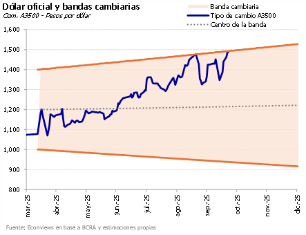 La elección del domingo en la provincia de Buenos Aires cambió todo. Las acciones se desplomaron, especialmente las de los bancos que cayeron hasta un 25% y el riesgo país pasó los 1,100 puntos básicos, alejando cualquier posibilidad de acceder al mercado en los próximos meses. La buena noticia fue que el dólar no se disparó. Inicialmente se depreció un 4%, aunque con el correr de los días fue subiendo para terminar la semana en AR$ 1,447, a solo 1.3% del techo de la banda de AR$ 1,467. Ya no todo marcha de acuerdo al plan.