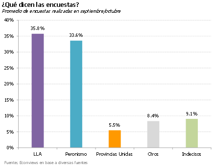 Las elecciones de la provincia de Buenos Aires fueron un golpe duro para el gobierno sobre el que se suman los problemas políticos internos y la incertidumbre económica. Asumimos que el resultado de las elecciones nacionales es más parejo y el mercado no lo percibe ni como muy bueno ni como muy malo.