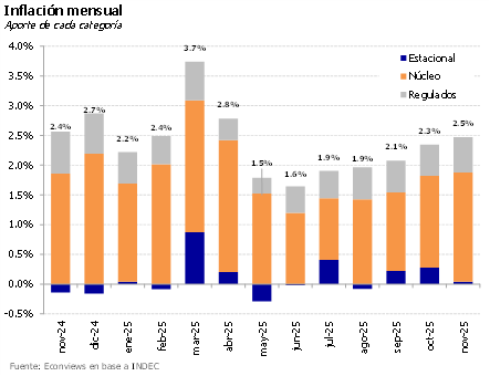 El dato de inflación de noviembre estuvo en línea con lo esperado, pero aun así encendió una luz amarilla. No es alarmante por ahora, aunque la tendencia de los últimos seis meses viene siendo claramente al alza. La inflación núcleo, que marca la dinámica más estructural, subió a 2.6%, el nivel más alto desde abril, y la variación interanual se aceleró por primera vez en la era Milei.