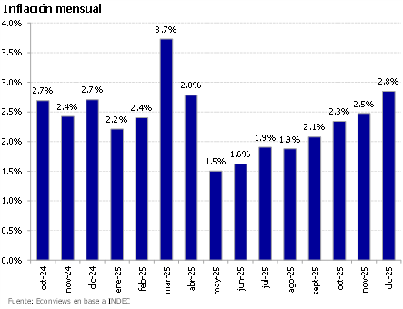 Feo dato de inflación. El 2.8% de diciembre estuvo por encima de lo esperado y encendió alguna luz amarilla. Si bien sabemos que el proceso de desinflación no es lineal, y que la inercia juega un papel más fuerte cuando la inflación no es tan alta, la realidad es que los precios se aceleraron por séptimo mes consecutivo. Desde el paso al esquema de bandas, el tipo de cambio dejó de funcionar como ancla nominal, y la política monetaria no ha sido lo suficientemente robusta para coordinar expectativas. Esa falta de un ancla clara es, hoy, lo que más ruido hace de cara al futuro. De todos modos, esperamos mejores números para los próximos meses y una inflación cercana a 25% para todo 2026.